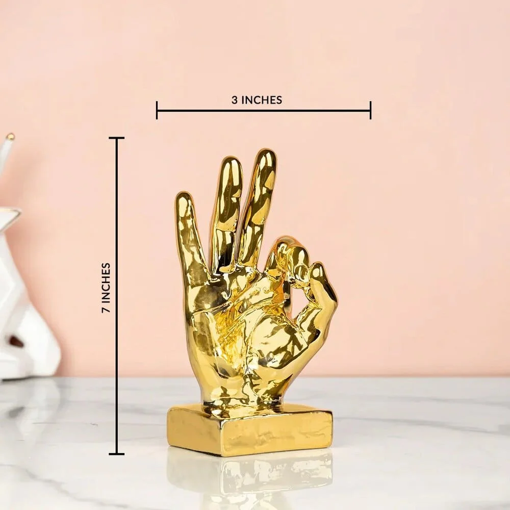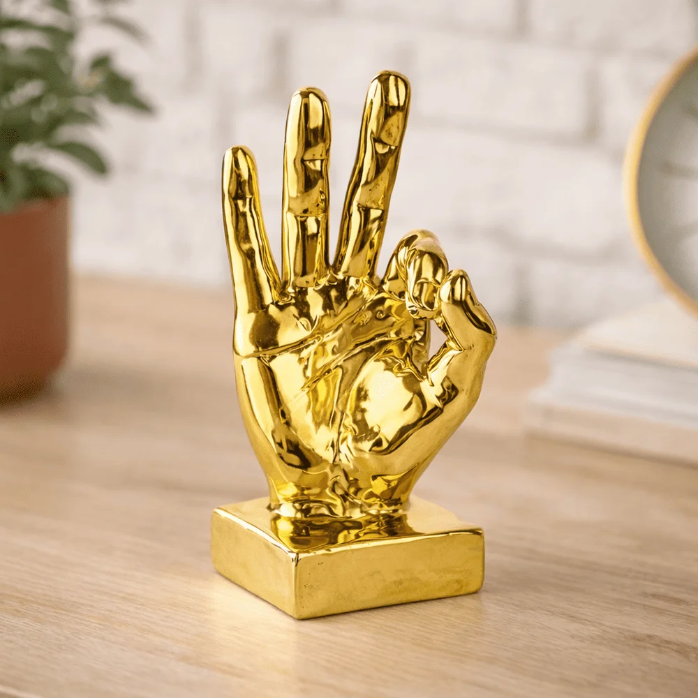 Make a statement with our Golden “OK” Finger Gesture Decorative Statue. Crafted to perfection, this showpiece showcases the iconic “OK” hand sign made by fingers, elegantly crafted in gleaming golden tones. Its symbolic meaning and stylish design make it a standout piece for tabletop decoration in any room. Whether displayed in your living room, study, or bedroom, it serves as a delightful accent that radiates positivity and affirmation.