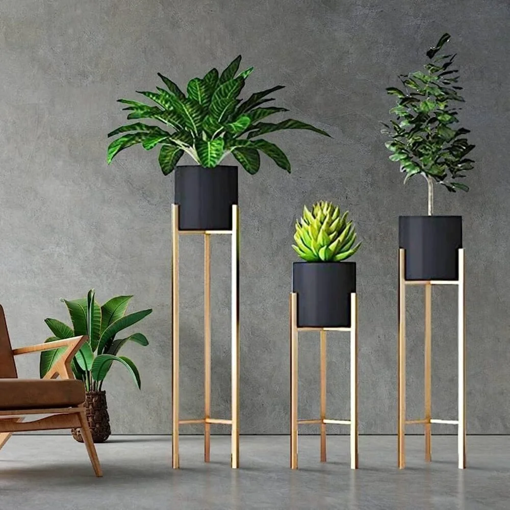 Modern Metal Floor Flower Planter with Stands for Living Room (Black)